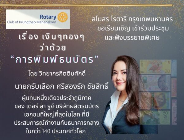 ภายในงานได้รับเกียรติจากวิทยากรผู้ทรงคุณวุฒิ นายกรับเลือก ศรีสองรัก ชัยสิทธิ์ บรรยายพิเศษในหัวข้อ “เรื่องเงิน ๆ ทอง ๆ ว่าด้วยการพิมพ์ธนบัตร” ซึ่งเป็นการถ่ายทอดความรู้และประสบการณ์จากการทำงานในฐานะผู้แทนหนึ่งเดียวประจำภูมิภาคของบริษัท เดอร์ ลา รูย์ (De La Rue) บริษัทผู้ผลิตธนบัตรเอกชนที่ใหญ่ที่สุดในโลก และมีประสบการณ์ร่วมงานกับธนาคารกลางในกว่า 140 ประเทศทั่วโลก สร้างความรู้ ความเข้าใจ และมุมมองที่น่าสนใจให้แก่สมาชิกเป็นอย่างยิ่ง